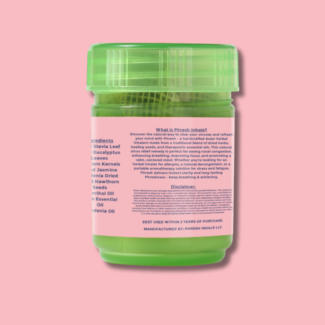 Discover the natural way to clear your sinuses and refresh your mind with Phresh – a handcrafted Asian herbal inhalant made from a traditional blend of dried herbs, healing seeds, and therapeutic essential oils. This natural sinus relief remedy is perfect for easing nasal congestion, enhancing breathing, improving focus, and promoting a calm, centered mind. Whether you're looking for an herbal inhaler for allergies, a natural decongestant, or a portable aromatherapy solution for stress and fatigue, Phresh delivers instant clarity and long-lasting Phreshness — keep breathing & achieving.